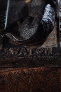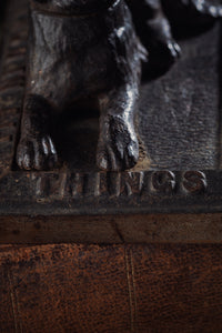 The base gives his name and the epitaph, "Watch Thou In All Things." On the underside of the base there is a bolt that can be unscrewed to adjust the direction of the dog's head.