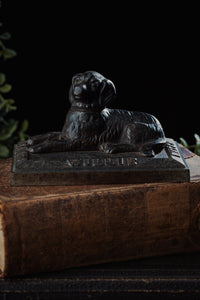 Cast in iron treated to look like bronze, this solemn, yet touching piece features Willie, an obedient Labrador, lounging on his bed.