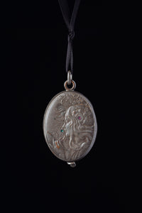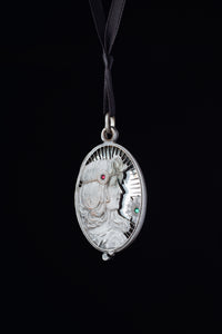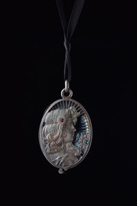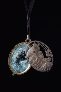 We decided this mirror was too spectacular to be hidden away in one's pocket, so we added a new ribbon to it and turned it into a pendant and the ultimate conversation piece.