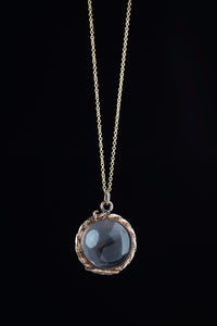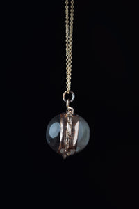 Pools of light jewelry utilizes simple, undrilled rock crystal either in an orb shape or two halved domes put together to form an orb. When light passes through the orb, it produced a tiny white pool of light, which looks particularly magical when worn as a necklace.