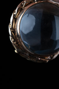 Rock crystal has one tiny chip near the bottom of one side. Some of the gold is slightly tarnished around the bezel on one side.