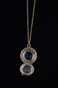 This exquisite locket features two bezel set halved domes of rock crystal fashioned in rolled gold (also known as gold filled). It hinges at the bottom allowing you to open it and insert a photograph, hair, flowers, or whatever flat talisman your heart desires.
