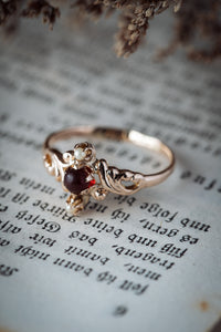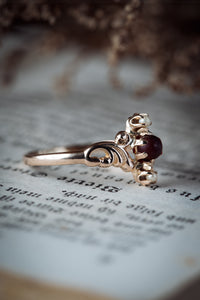 Garnet cabochon is moderately abraded making it opaque. This is a common issue with bullet cabochons. It's still a great, moody little ring.