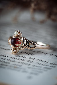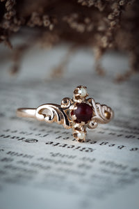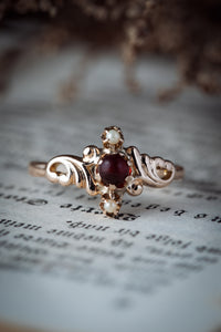 This showstopper features an unusual blood red garnet bullet cabochon centerpiece accented with two tiny seed pearls.
